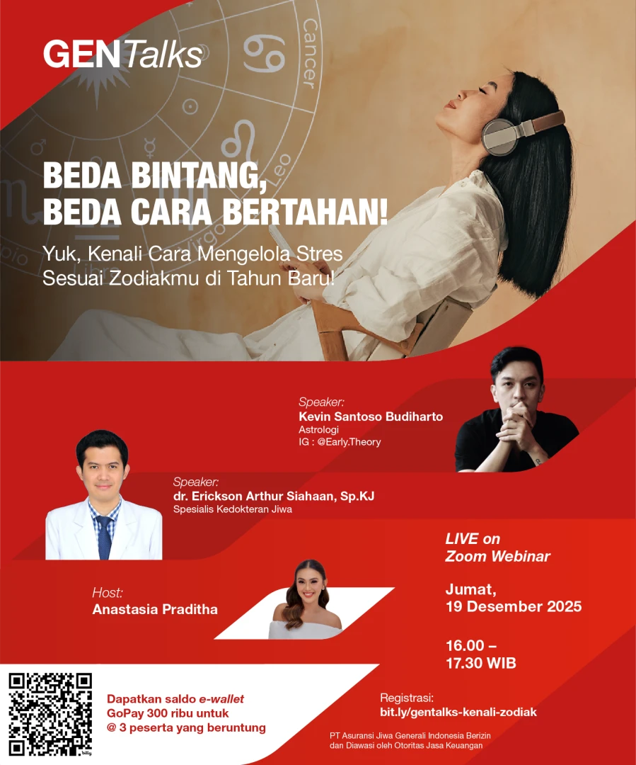 Yuk, ikuti GENTalks: BEDA BINTANG, BEDA CARA BERTAHAN! Kenali cara mengelola stres sesuai zodiakmu di tahun baru, hanya di GENTalks bersama Kevin @Early.Theory (Astrolog) & dr. Erickson Arthur, Sp.KJ (Psikiater)