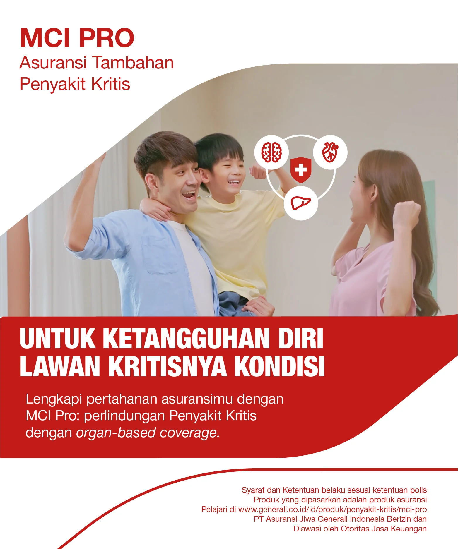 Saat yang lain membatas-batasi jumlah kondisi yang dilindungi, Generali Indonesia menghadirkan proteksi terhadap penyakit kritis tanpa batas jumlah penyakit, melainkan menggunakan sistem organ (organ-based). MCI Pro merupakan solusi asuransi tambahan (rider) terhadap penyakit kritis untuk melengkapi produk asuransi utama kamu dari Generali Indonesia. Dengan memiliki MCI Pro, kamu akan lebih leluasa jadi tangguh menghadapi risiko penyakit kritis yang bisa terjadi pada siapa saja dan kapan saja. MCI Pro dibagi menjadi 2 jenis, bergantung pada produk proteksi utama yang dimiliki. Klik pranala di bawah ini untuk membaca lebih lanjut! MCI Pro Plus (untuk Polis produk BeSMART Link Ultima) MCI Pro 315 (untuk Polis produk BeSMART Lite)